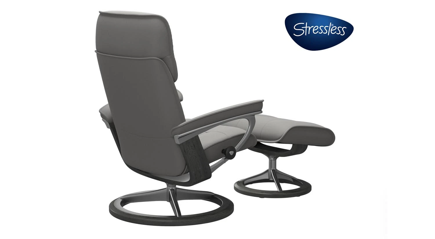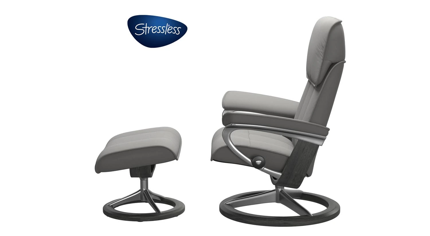 The Admiral Stressless Recliner features the classic Stressless look with supple cushioning for extra comfort. Each chair uses the PlusSystem, which adjusts the headrest to maintain optimal neck support as you recline. These chairs also have the Signature Base, which enables smooth swivel, rock, and recline motion.