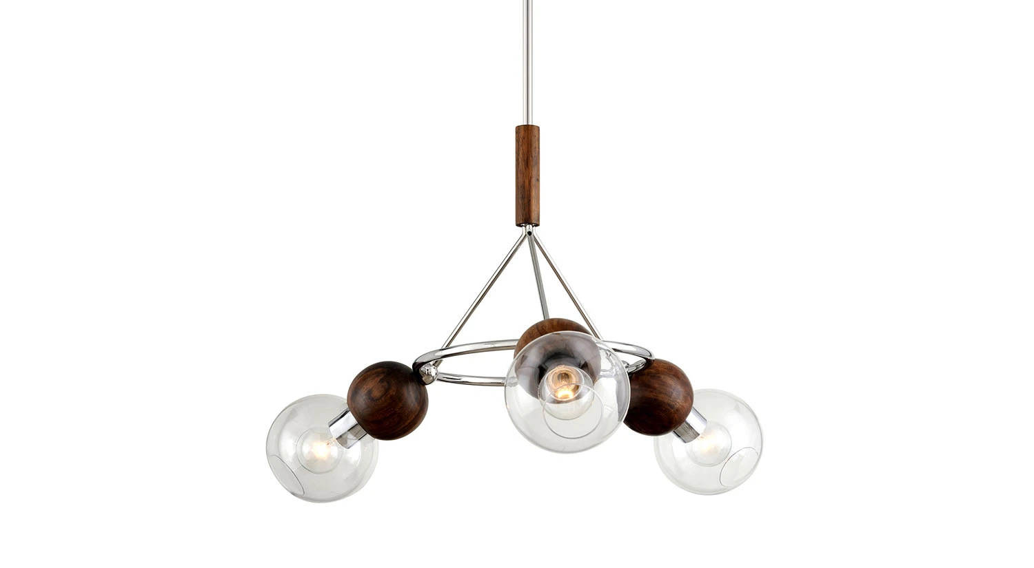 The Arlo Small Chandelier is distinguished by a tasteful blend of contrasting materials, creating a mid-century modern style. Three lights around its sleek, intriguing design are covered by orb-like shades to give the home a beautiful ambiance.