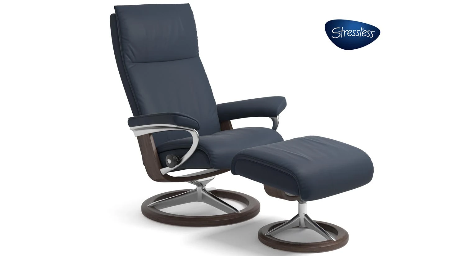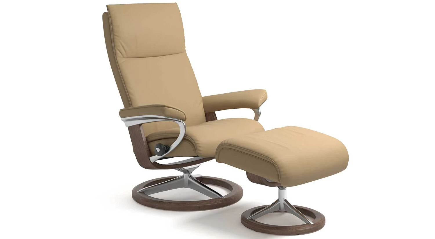 The Stressless Aura recliner is tall and slim but very comfortable. The recliner has a swivel feature and the patented Stressless Glide System, which ensures maximum support for the entire body. This Aura also has the Signature Base, which enables smooth swivel, rock, and recline motion.