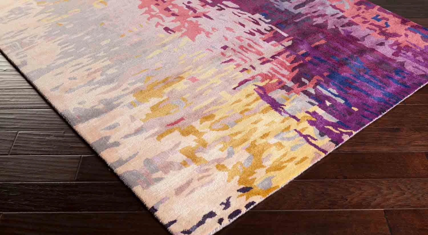 Hand tufted with a canvas backing, lustrous sheen, and medium pile.