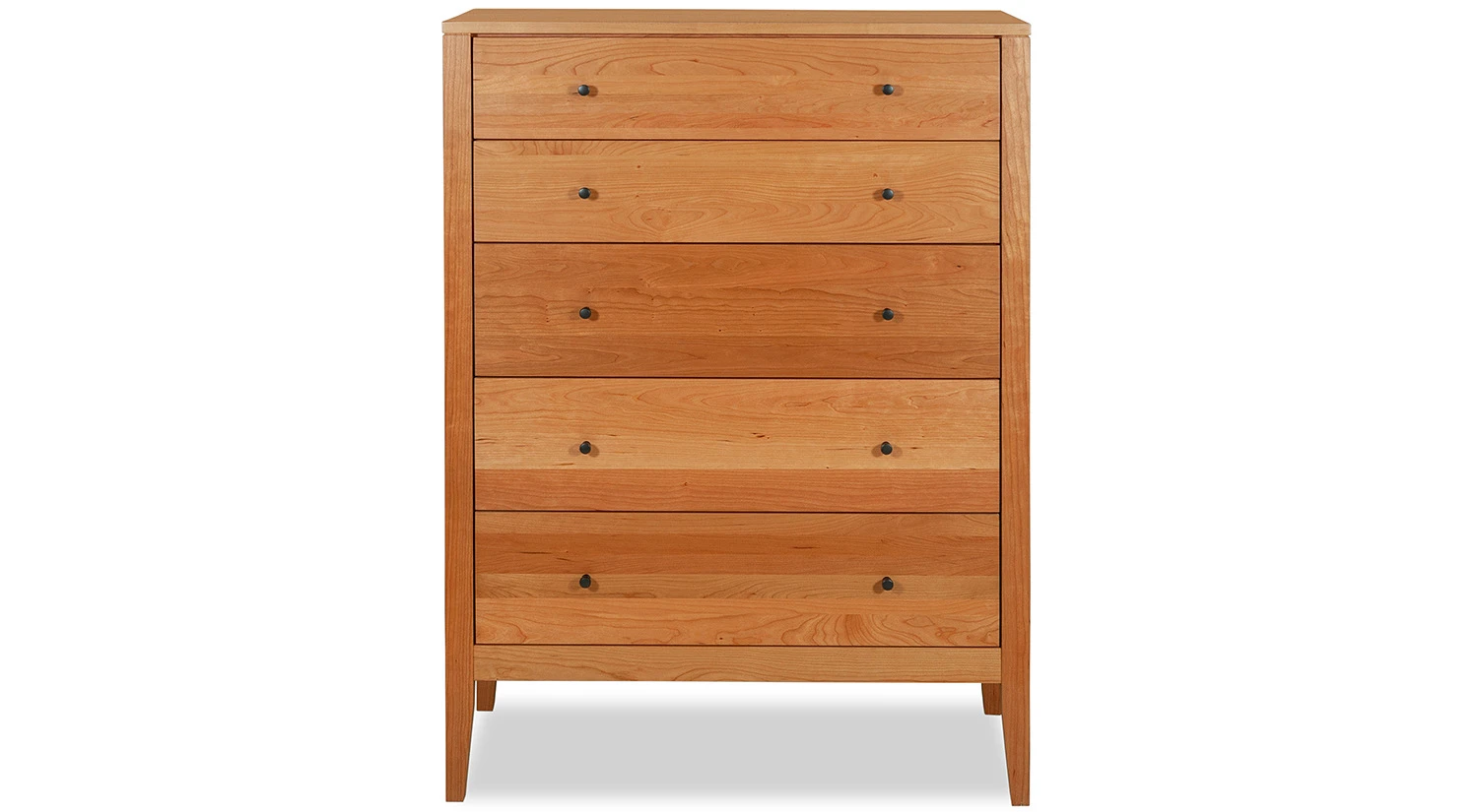Made in Vermont, the Brandon 5 Drawer Chest is made from solid wood with select veneers on side and drawers. Crafted with English dovetail drawers and undermount glides for soft closure.