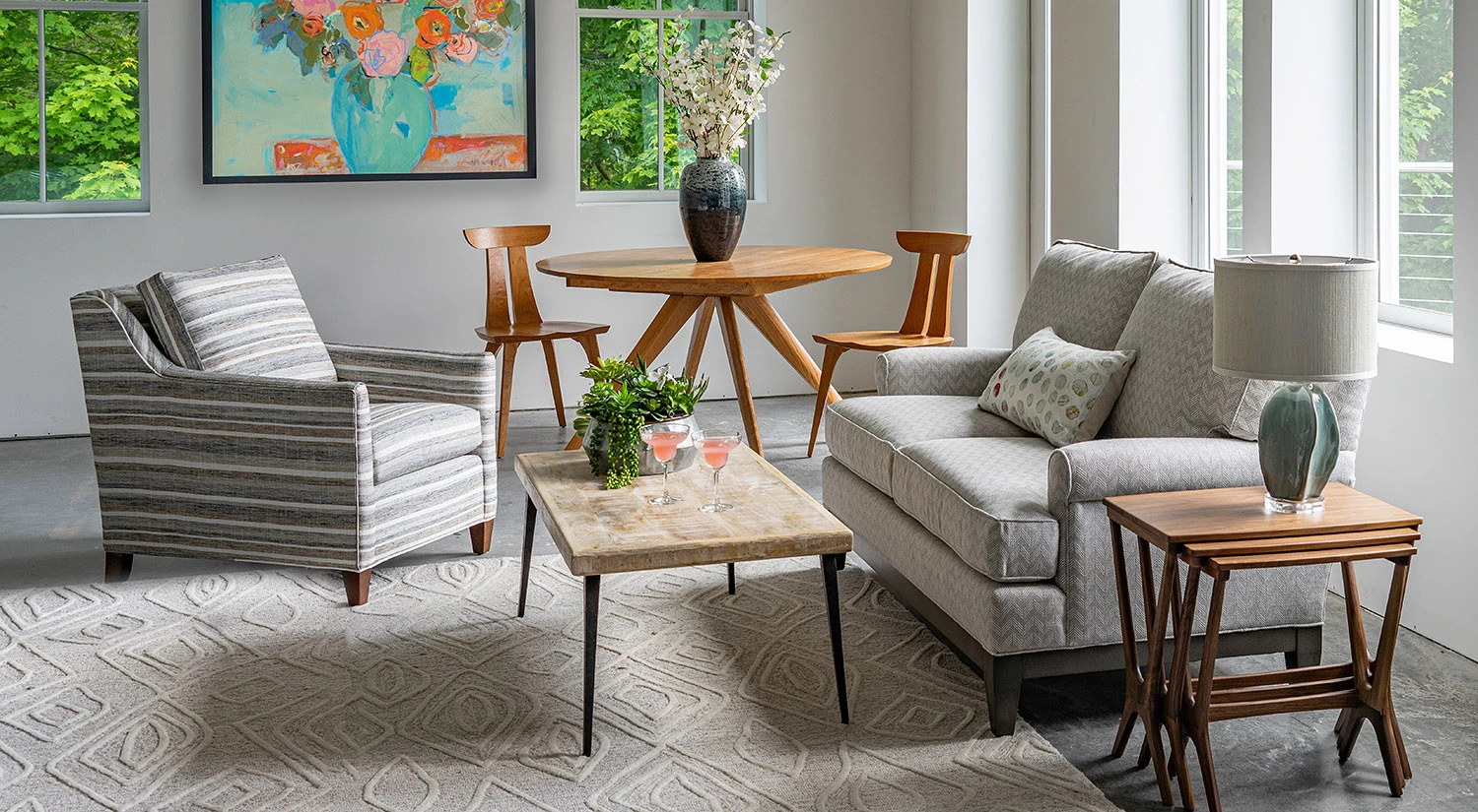 The Camden collection really stands out with it’s attractive wood base and delicate rolled arm. The sofa comes with two toss pillows.