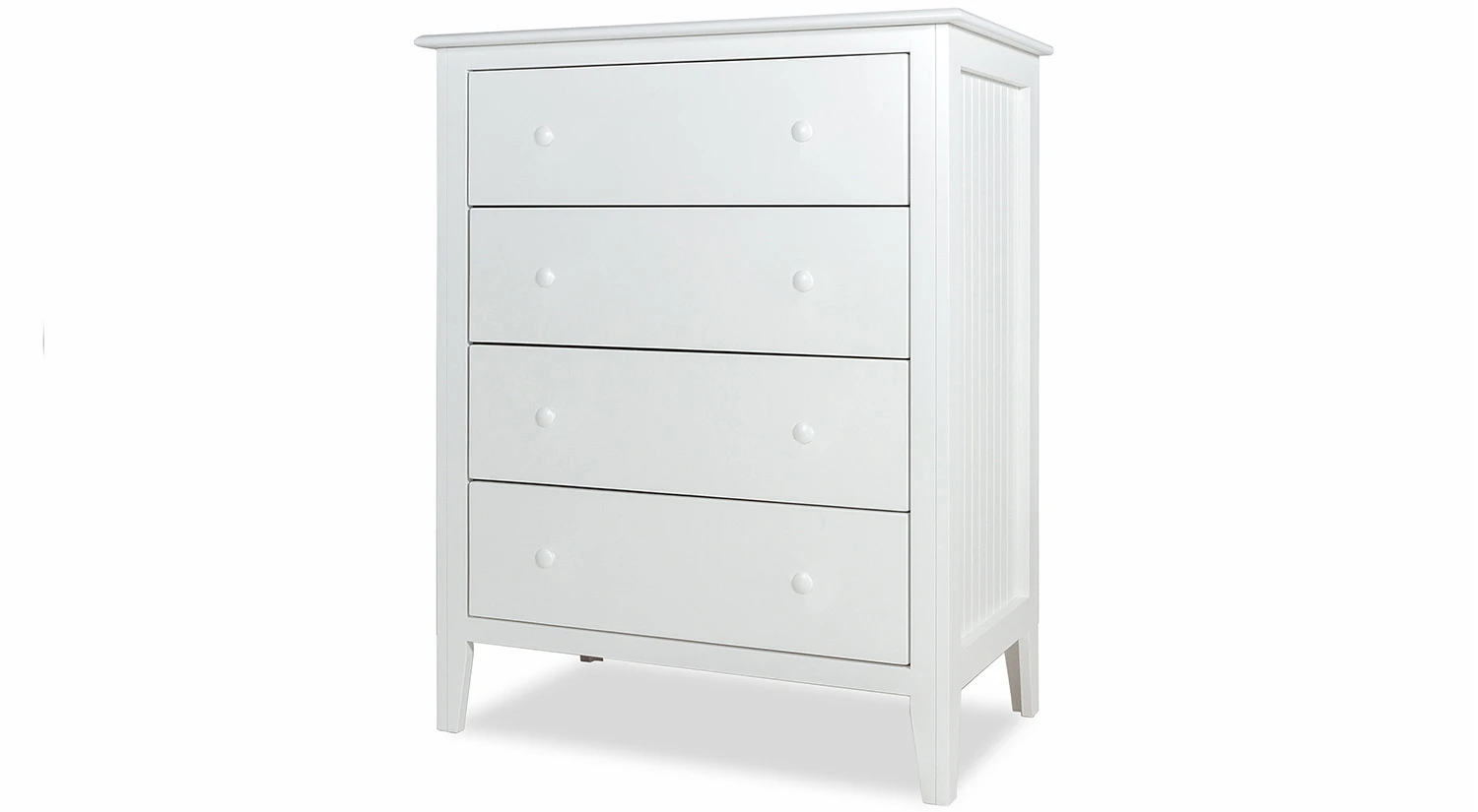 The Canterbury 4 Drawer Chest from Revolution Furniture is made from birch wood locally in New Hampshire and is available in a variety of paints and finishes. With beadboard siding, the Canterbury has a modern cottage style.