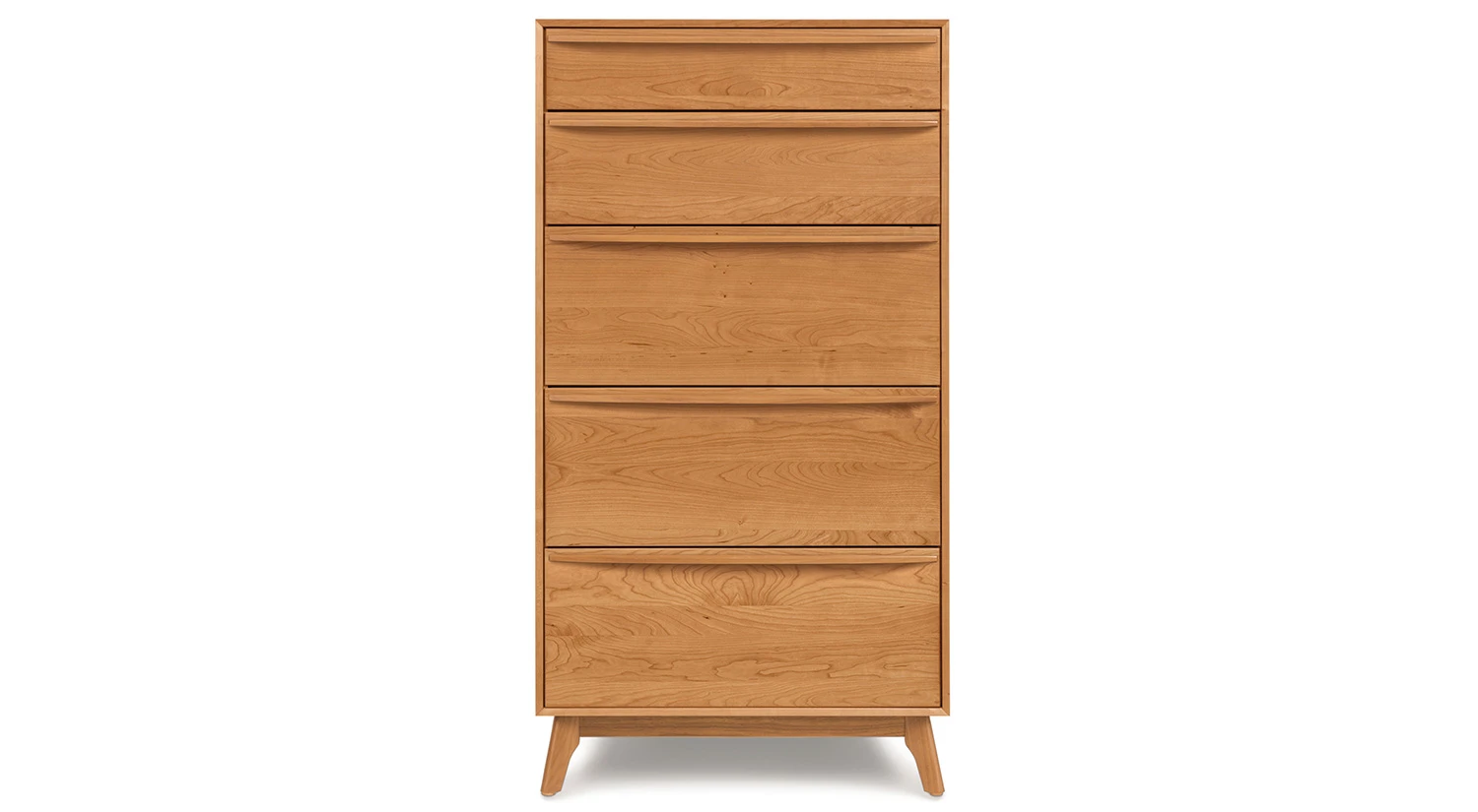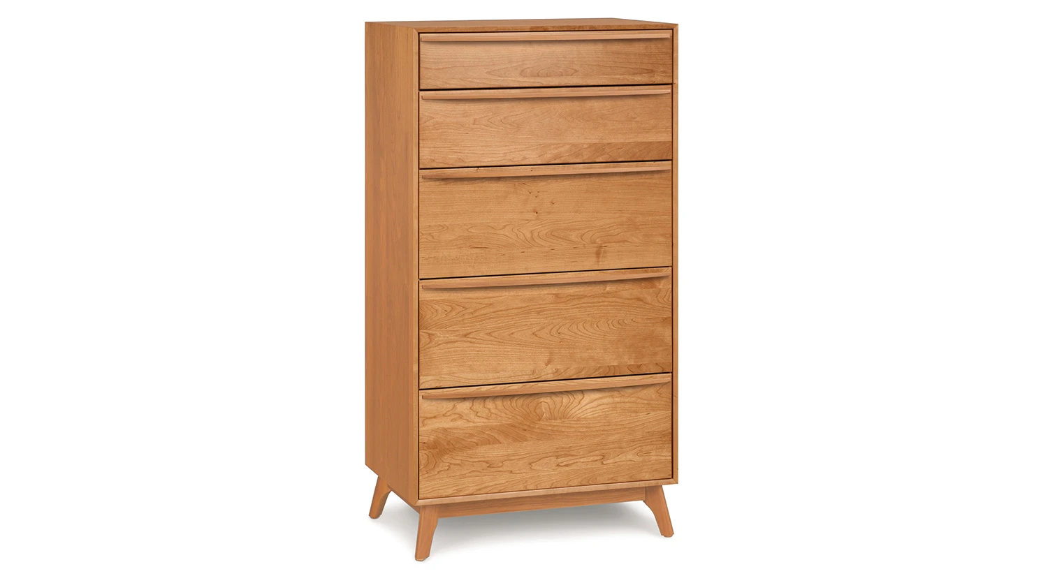 The Catalina 5 Drawer Narrow Dresser features soft-close, self-close drawer glides.