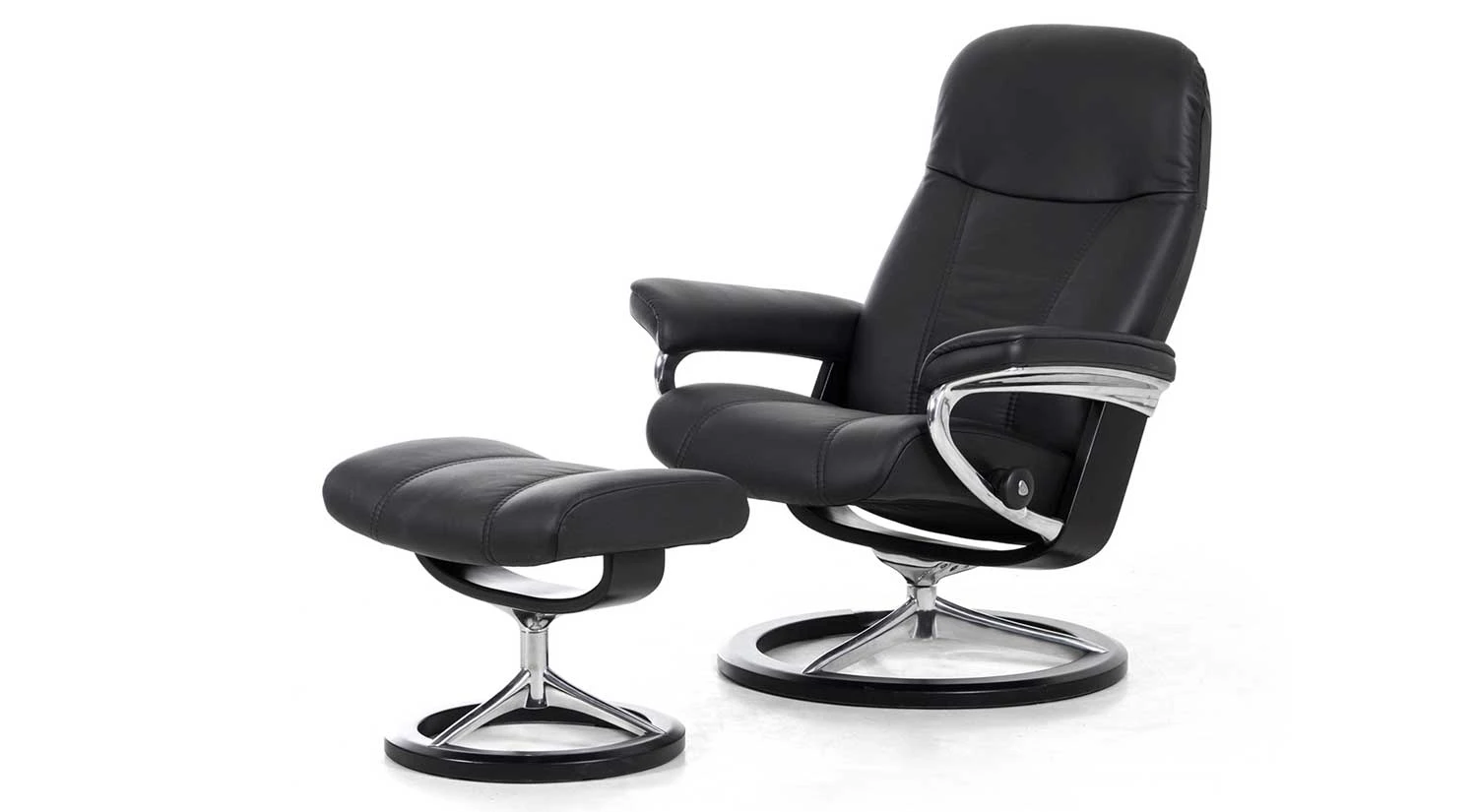 The Consul Stressless Recliner features the classic Stressless look with simple lines. Each chair uses the GlideSystem, which automatically adjusts the chair as you recline. These chairs also have the Signature Base, which enables smooth swivel, rock, and recline motion.