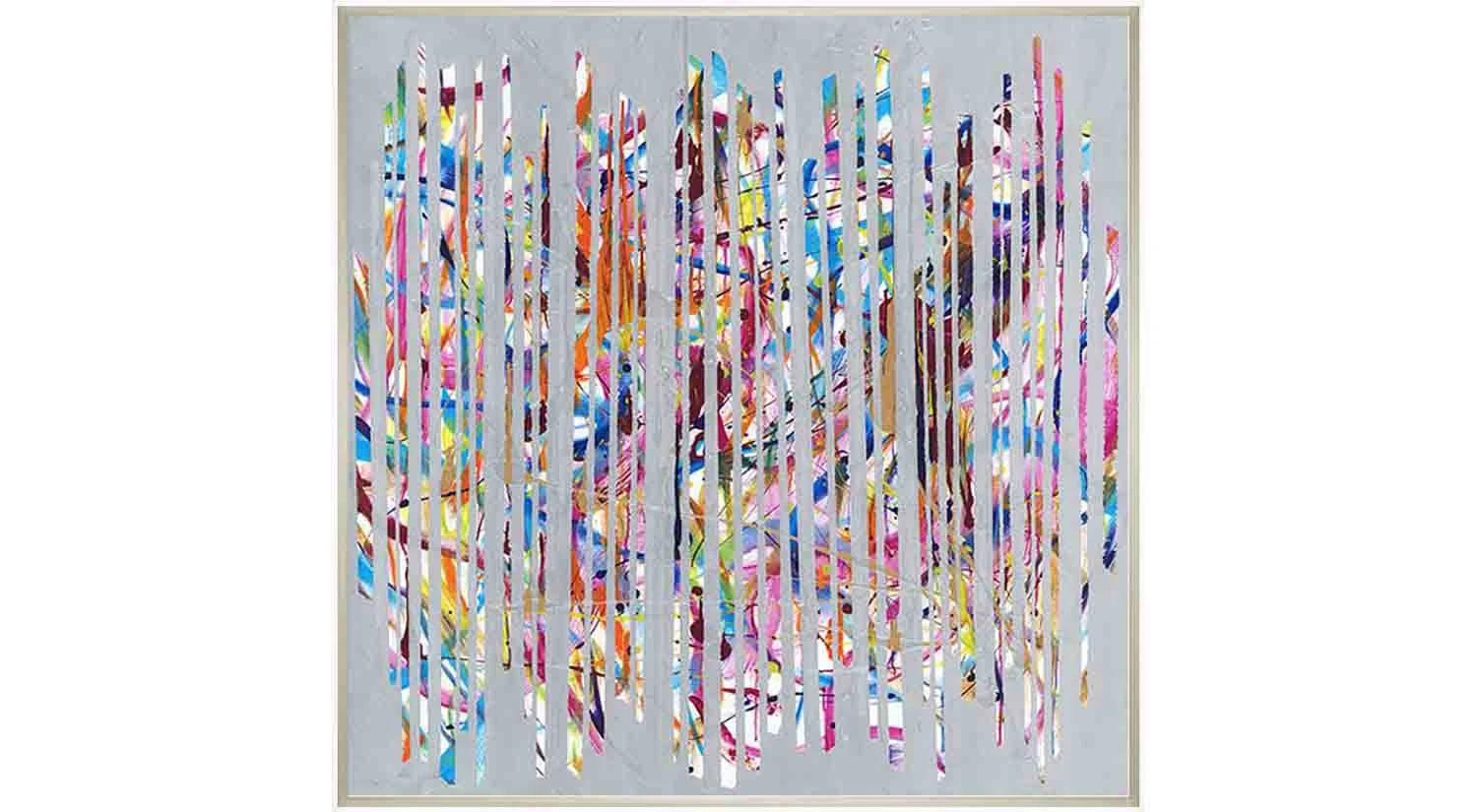 Fragments of Imagination is an abstract art piece where thin, colorful lines displayed on a gray background show a glimpse into the imagination.