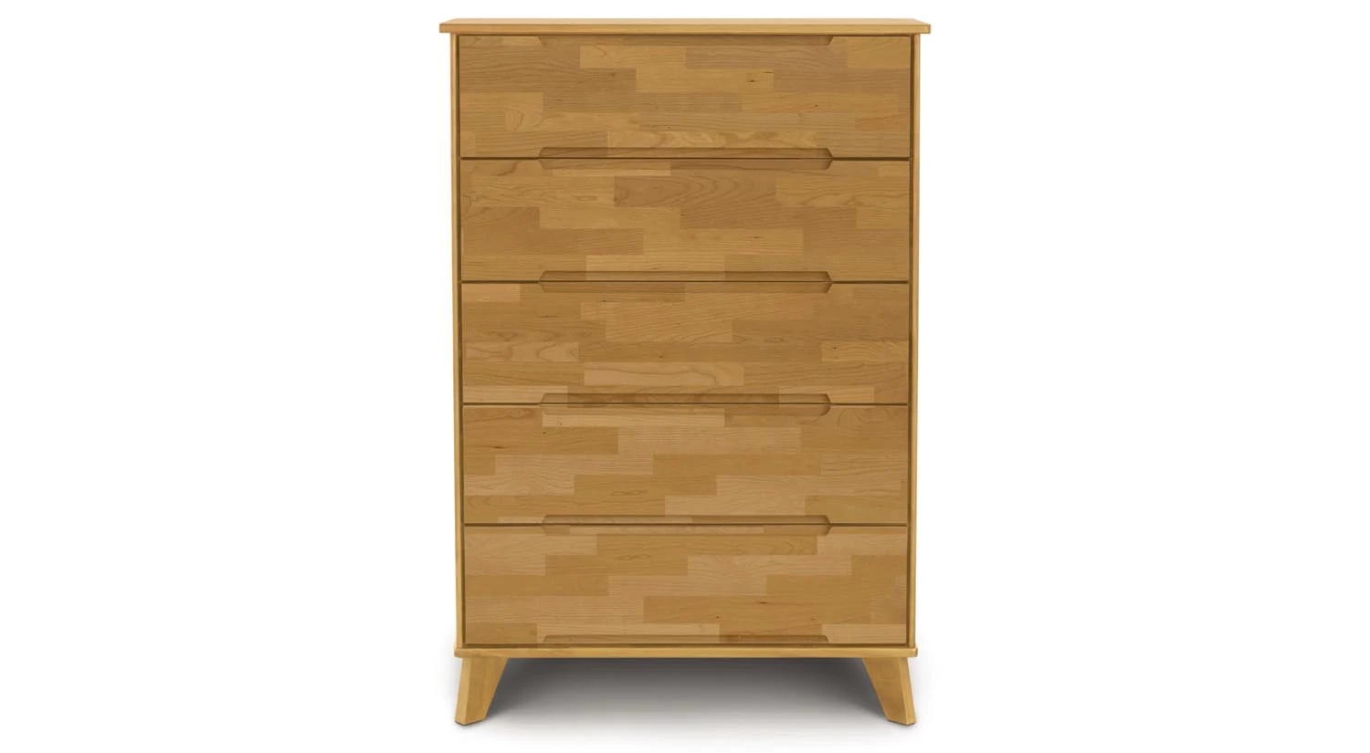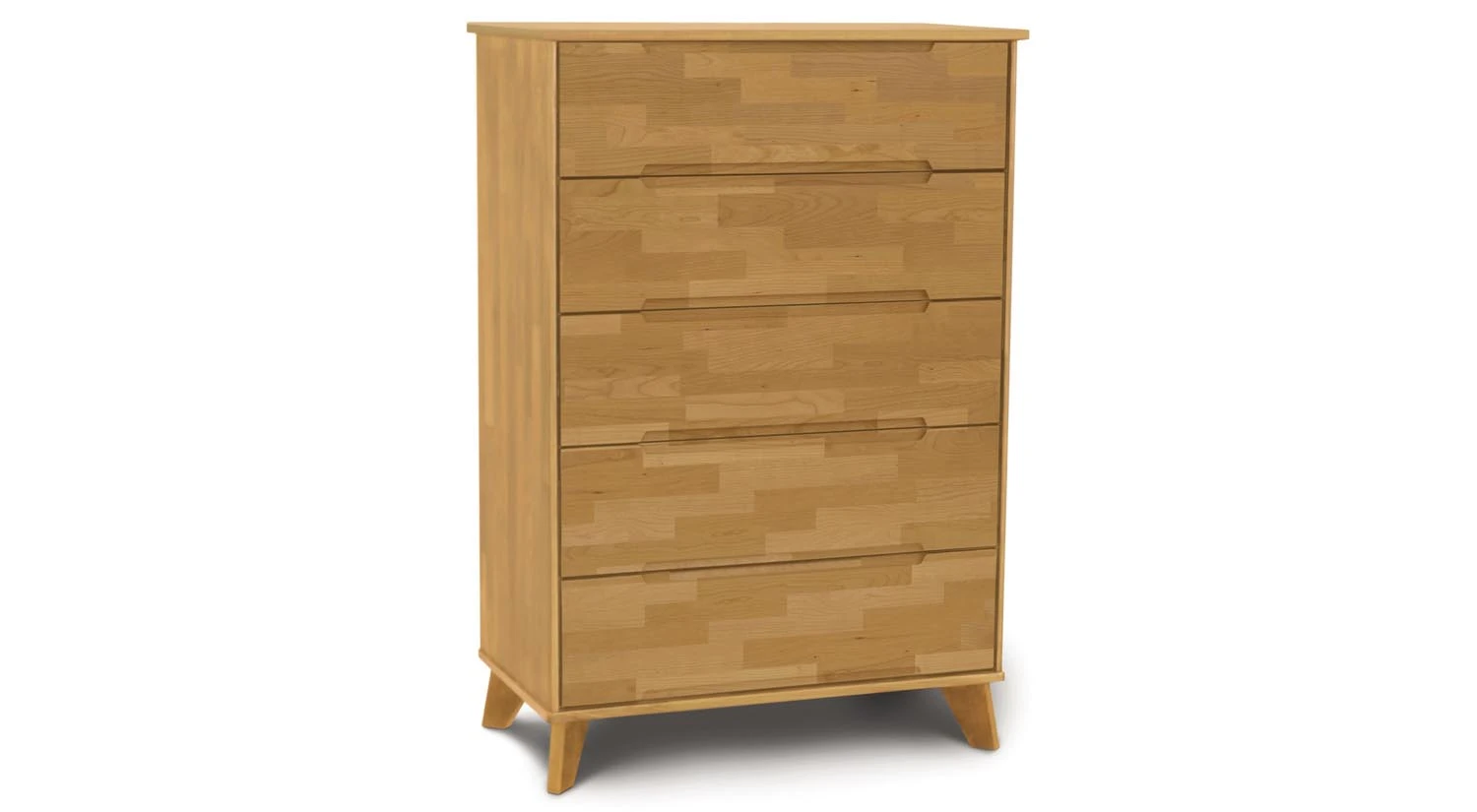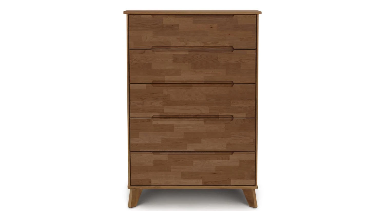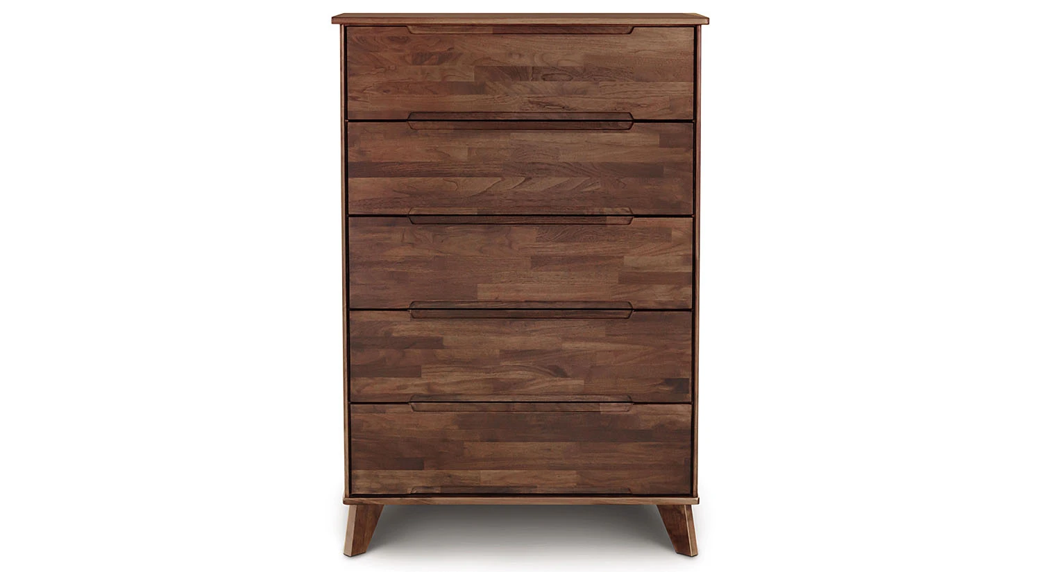 Copeland Furniture champions sustainable lumber and eco-friendly production. The Linn 5 Drawer Dresser is composed from upcycled, reclaimed American black walnut or cherry hardwood and features a contemporary design and a beautiful natural finish. Also Available in Natural Cherry and Saddle and Natural and Stained Oak finishes.