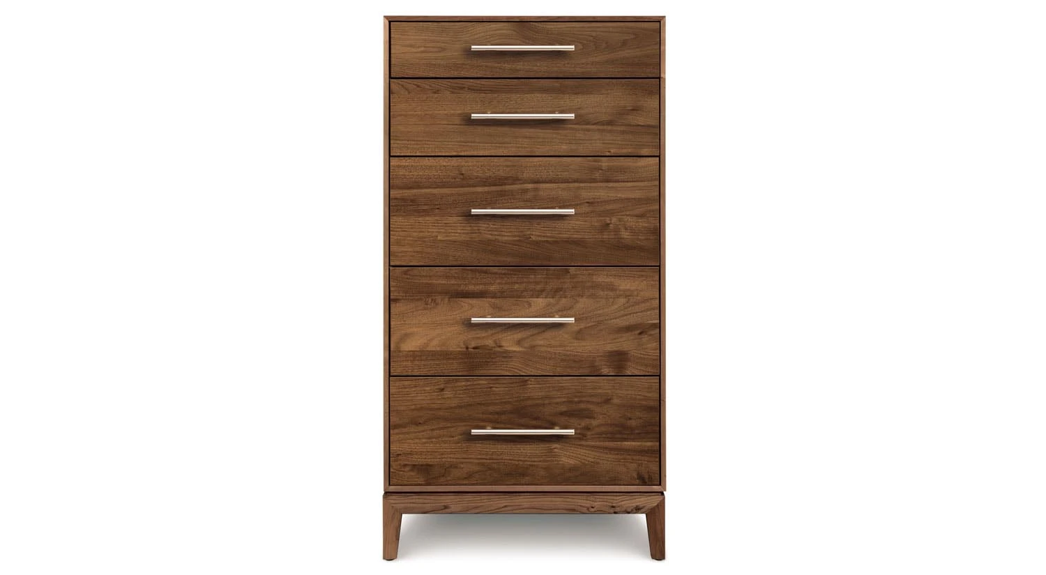 The Mansfield Collection from Copeland offers a sophisticated look with contemporary lines. Made from solid cherry or walnut hardwood in Vermont, it has soft close drawers with optional black bronze pulls on cherry wood case and long nickle bar pulls on walnut cases.