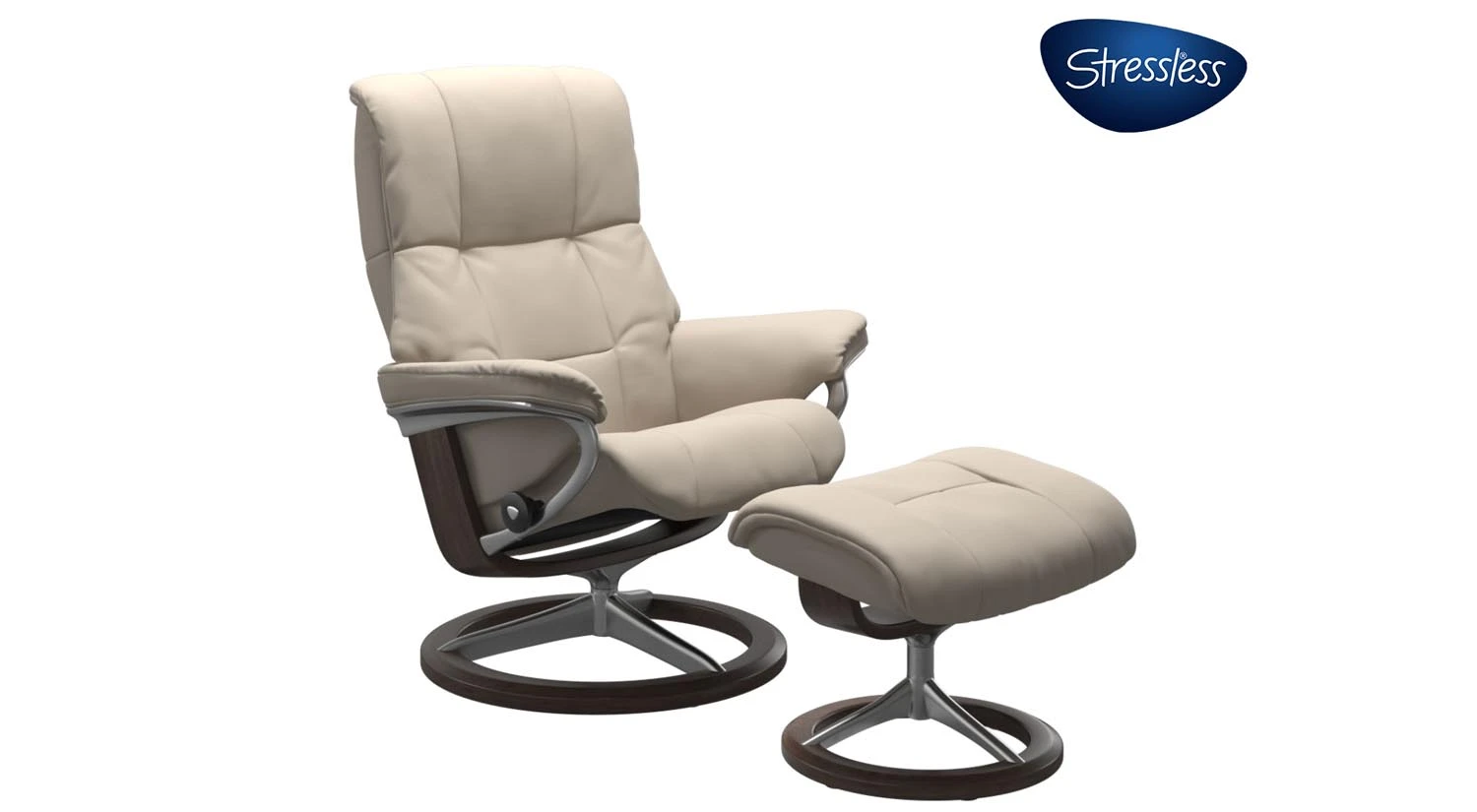 The Mayfair Stressless Recliner features the classic Stressless look with supple cushioning for extra comfort. Each chair uses the PlusSystem, which adjusts the headrest to maintain optimal neck support as you recline. These chairs also have the Signature Base, which enables smooth swivel, rock, and recline motion.