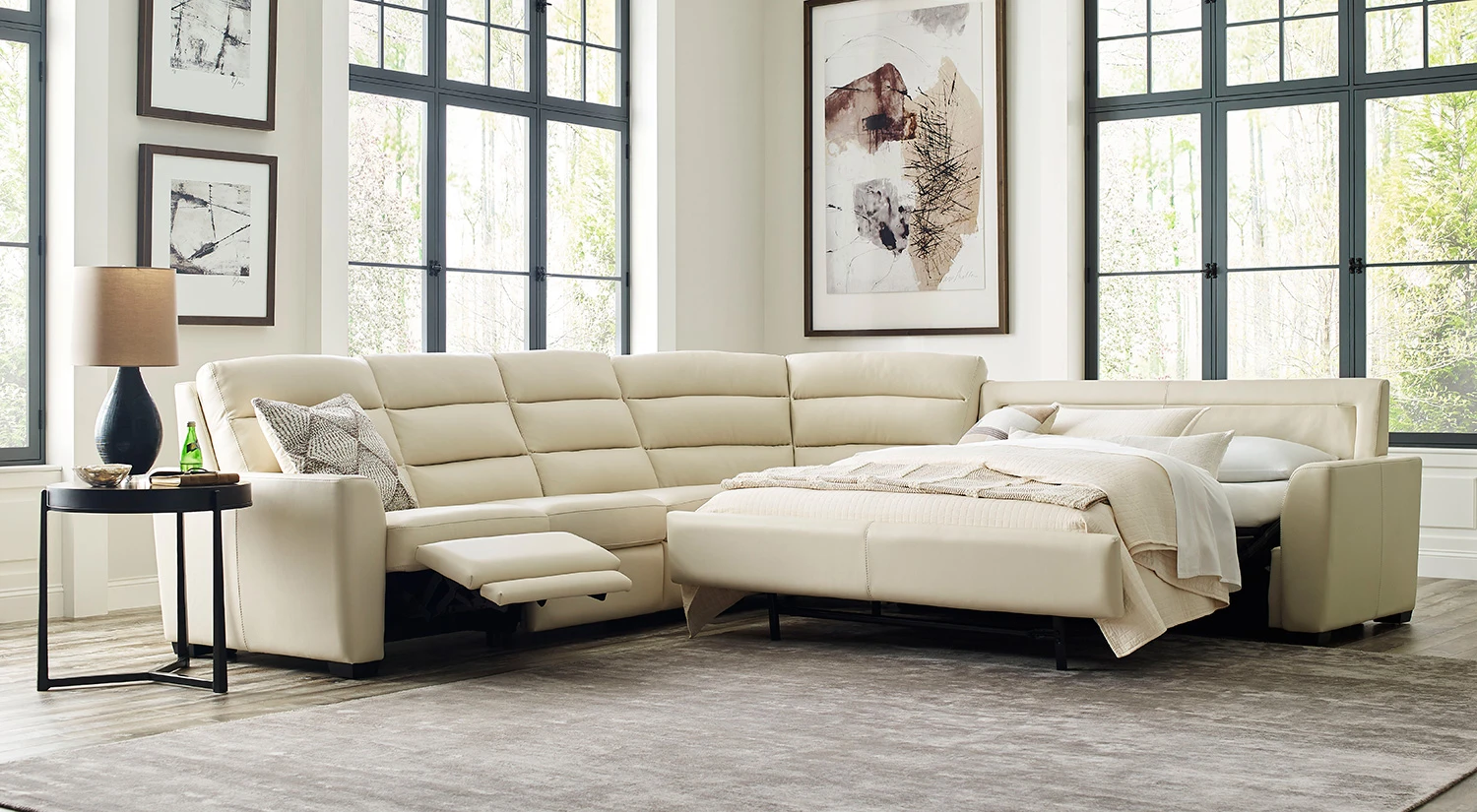 Elegant and serene, the Napa Power Sectional Sleeper has a contoured sloping track arm and clean lines inspired by the views of the vineyards of Napa Valley. We’re offering the Napa Power Sectional Sleeper online in Bison Leather with 3 power seats, which can each recline with the touch of a button.