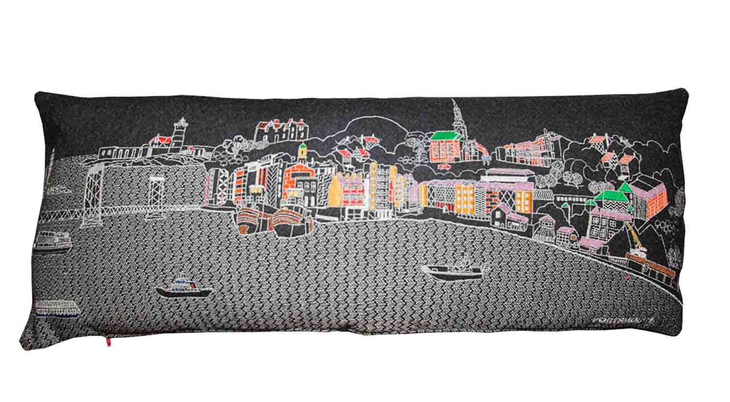 We love this beautiful embroidered pillow of the Portsmouth sky line. Made from wool and linen.