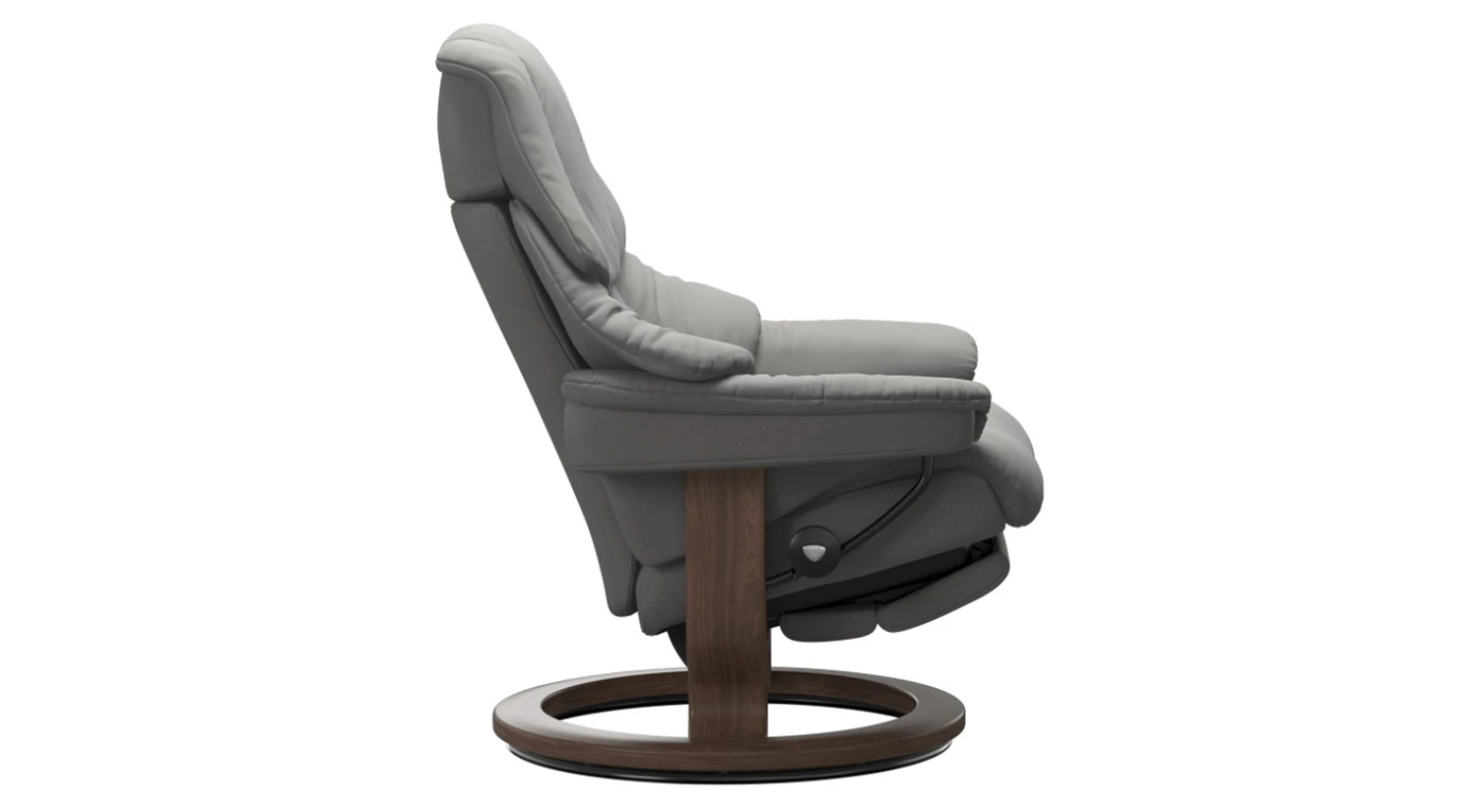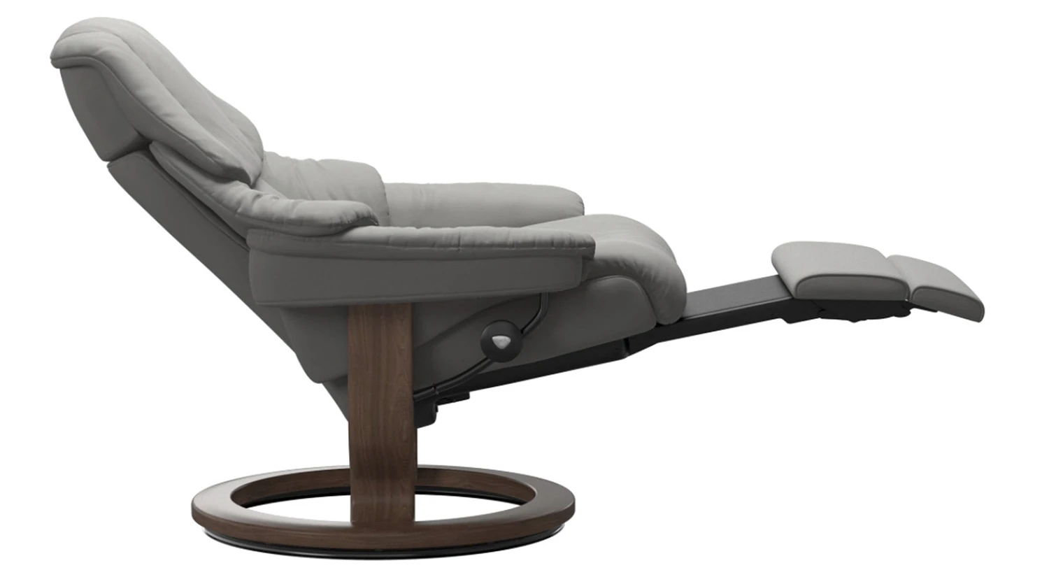 The Reno Stressless Recliner with Power Leg and Back technology allows you to recline to the perfect position with the touch of a button. As you relax, the headrest adjusts to maintain optimal neck support.