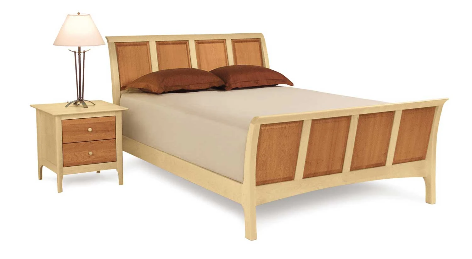 The Sarah Collection from Copeland exhibits the clean lines and balanced proportions of its Shaker influence. The Sarah Sleigh bed and cases are available in solid cherry in a variety of finishes or a combination of cherry and maple. The Sarah 45″ Sleigh Bed is available as both a mattress/box spring or platform style.