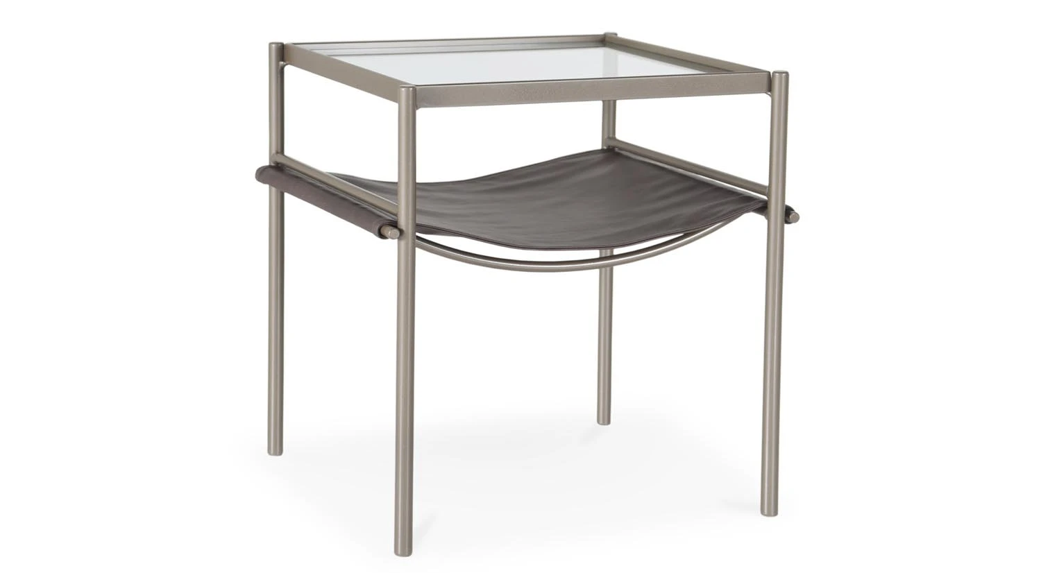 The Sling Drink Table has a minimalist feel while making room for style and functionality. Its beautiful combination of materials consists of a solid steel frame and glass top in addition to a leather sling on the bottom that can be used for storage.