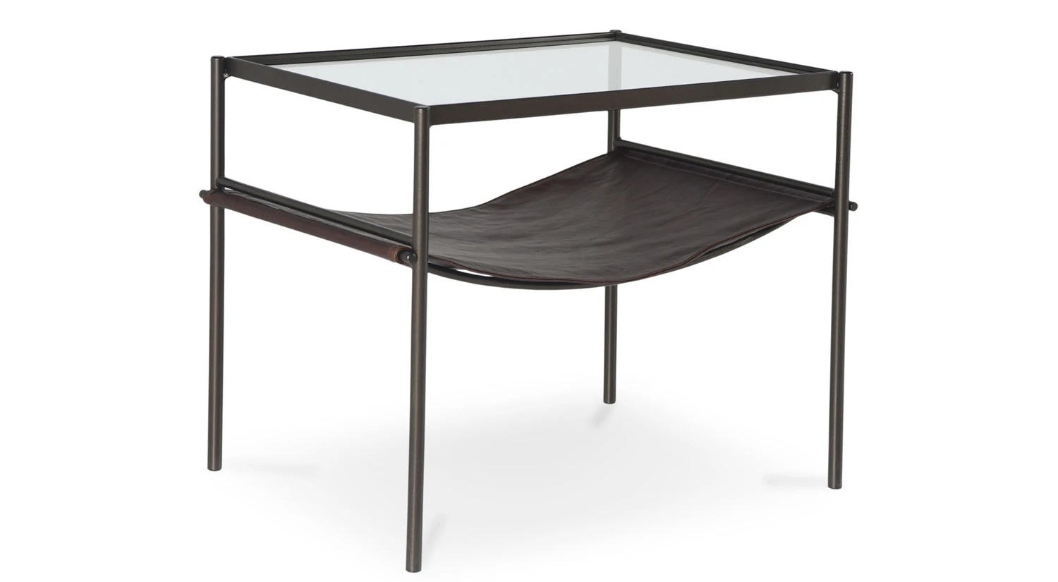 The Sling End Table has a minimalist feel while making room for style and functionality. Its beautiful combination of materials consists of a solid steel frame and glass top in addition to a leather sling on the bottom that can be used for storage.