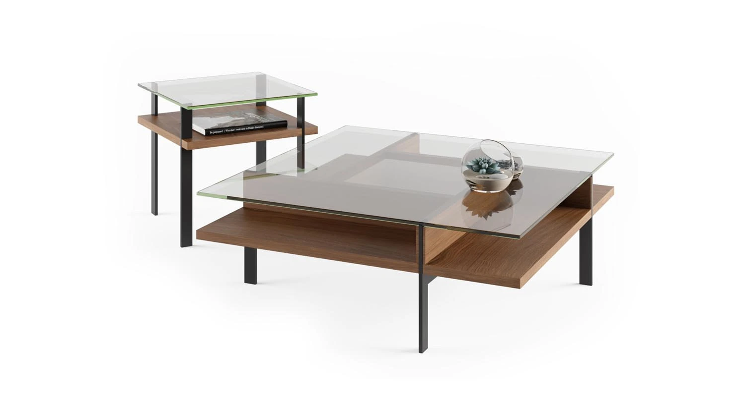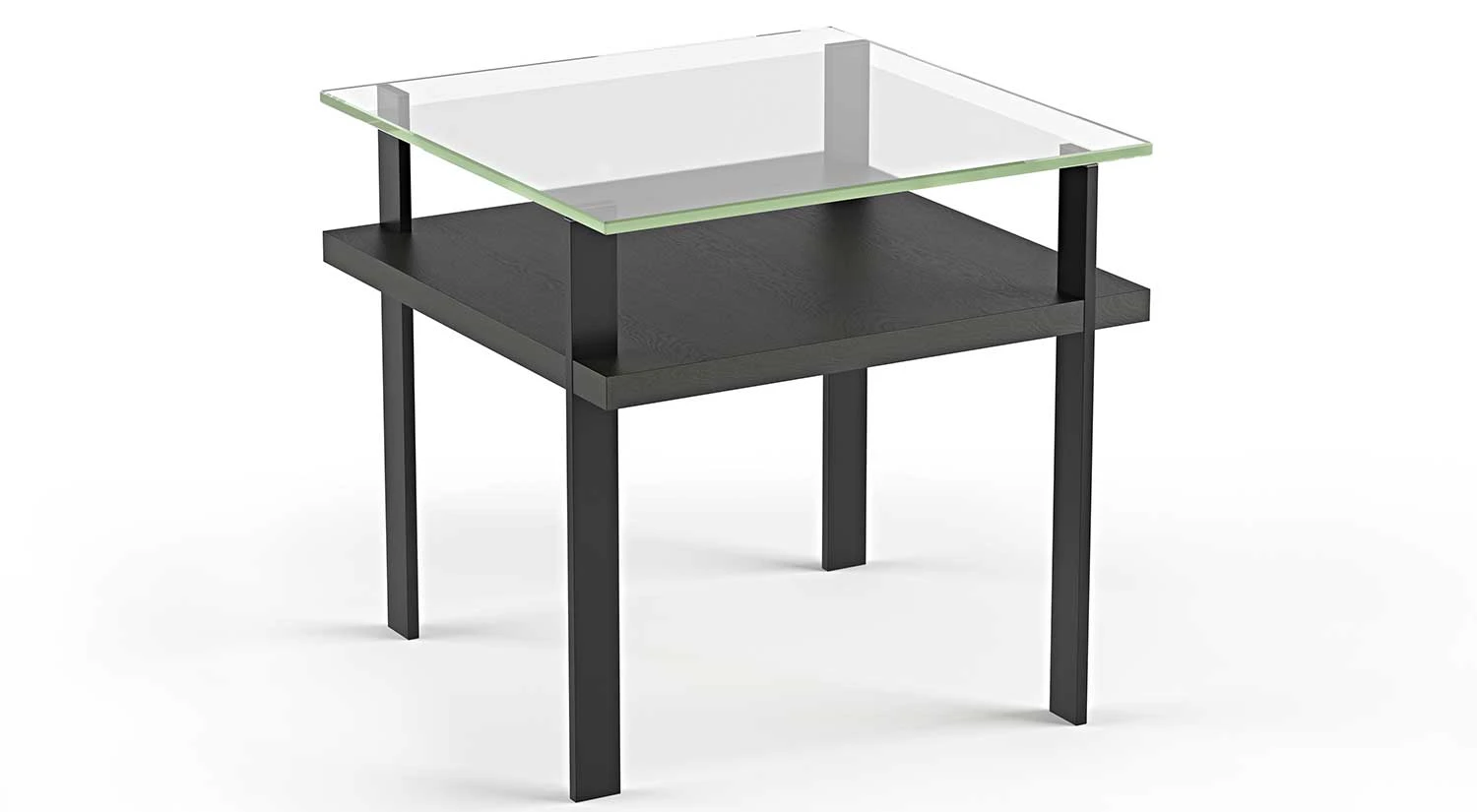 The Terrace End Table showcases a tasteful blend of contrasting materials. A floating glass top provides space for lighting and decorative display while resting elegantly above an open shelf for additional items. This table pairs beautifully with the Terrace Rectangular Cocktail Table and the Terrace Console Table for a complete living room setup.