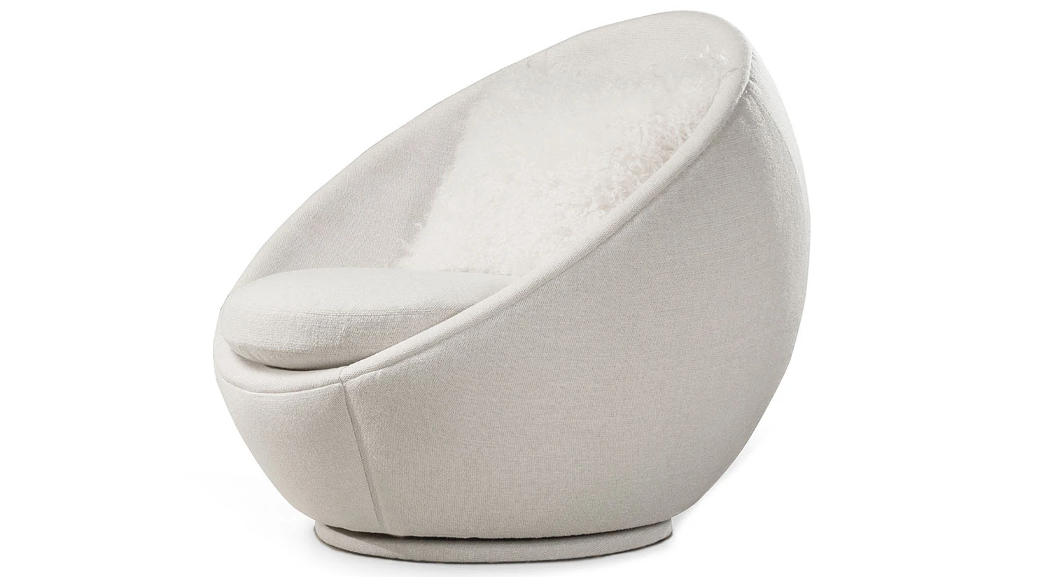 The Good Egg Chair by Thayer Coggin features an upholstered swivel base, barrel design, and midcentury modern flare.