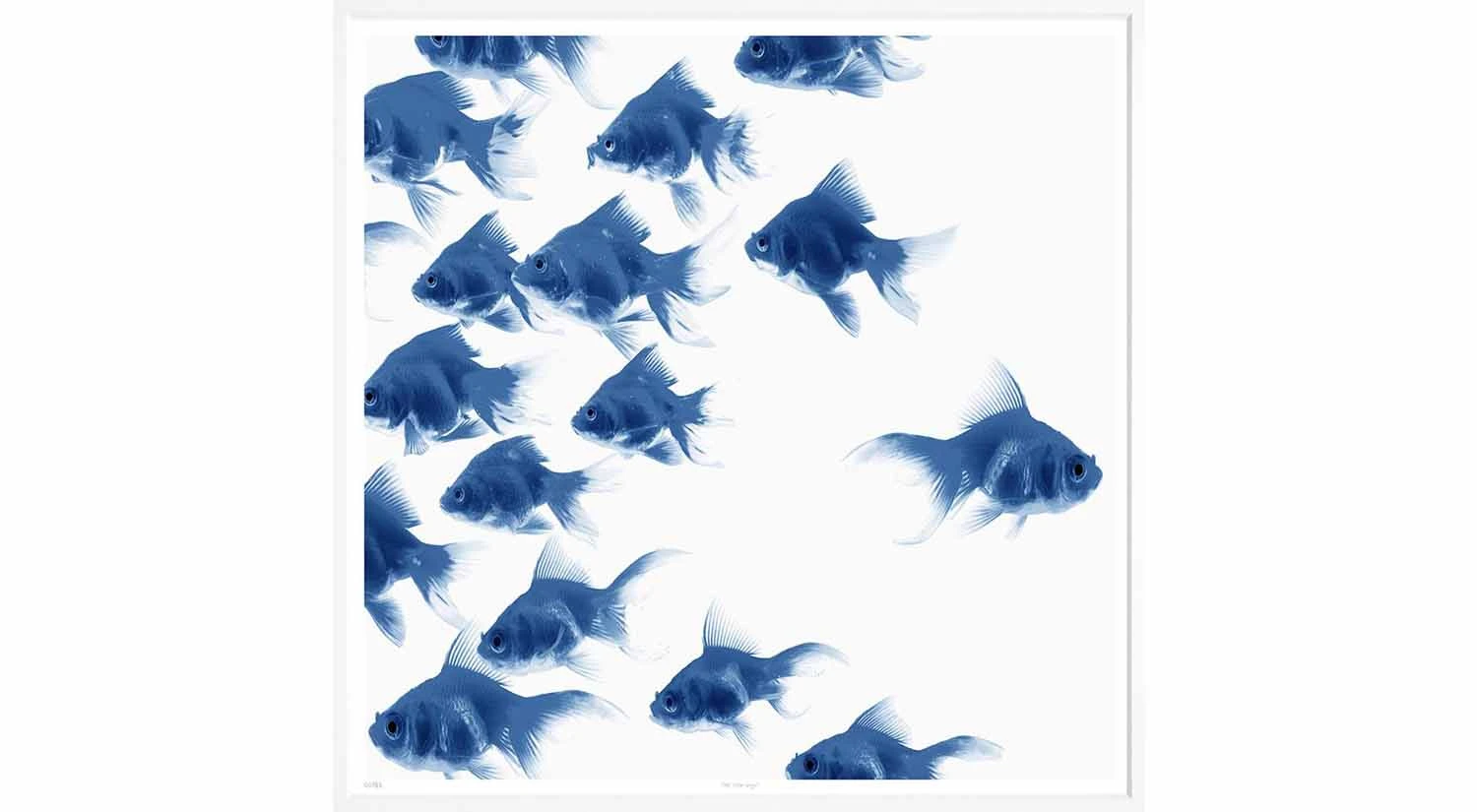 A school of vibrant blue fish in The Other Way l captures the idea of taking your own path instead of following the crowd.