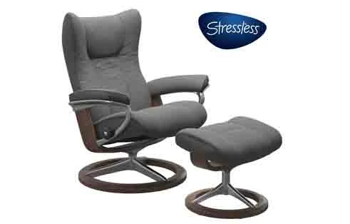 The Wing Stressless Recliner features the modern look with padded arms and a sculpted design. Each chair uses the GlideSystem, which automatically adjusts the chair as you recline. These chairs also have the Signature Base, which enables smooth swivel, rock, and recline motion.